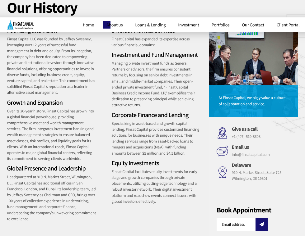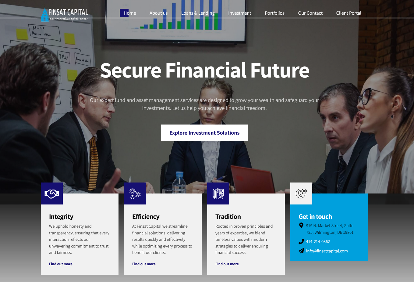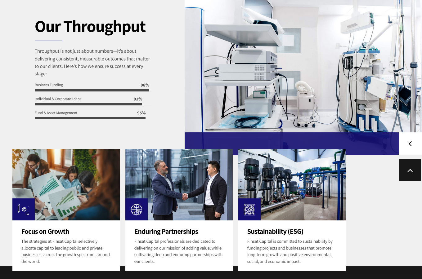 Direkt im sichtbaren Bereich: klare Value Proposition, animierte KPIs (z. B. verwaltetes Vermögen, Kundenzufriedenheit), Trust-Elemente (z. B. SEC-Konformität), sowie Testimonials im Slider-Format.